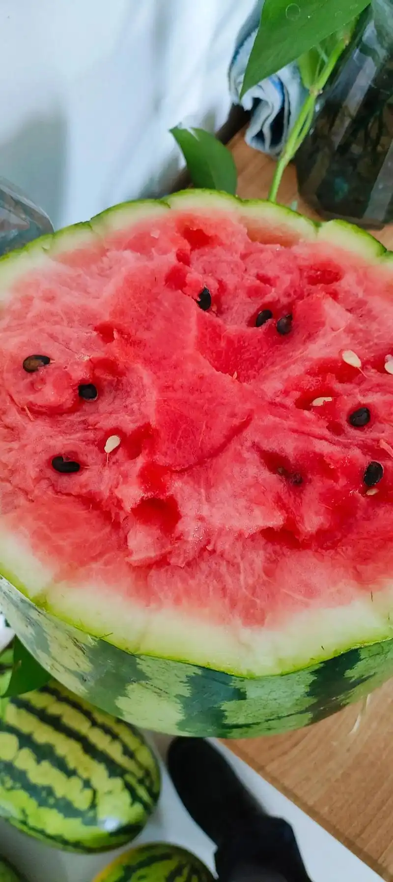 正盛暑、拿来啃,清凉尤如雪。好甜蜜、红瓤多汁,降温还解渴。