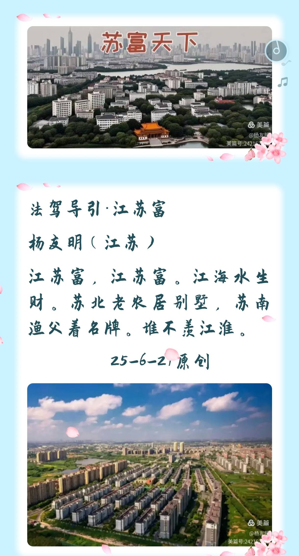 2.文化生活:他提到苏州的评弹、昆曲和苏绣,体现了苏州丰富的文化底蕴。同时,杨友明也描绘了苏州的诗词韵律和文人雅逸,表现出他对苏州文化的欣赏。