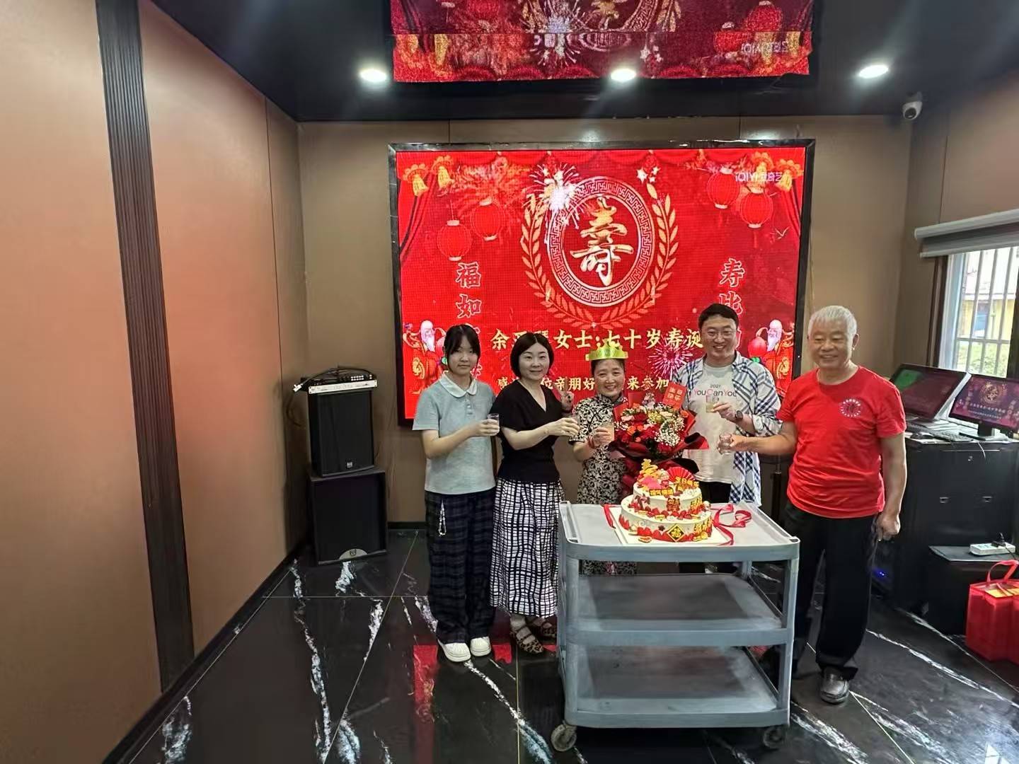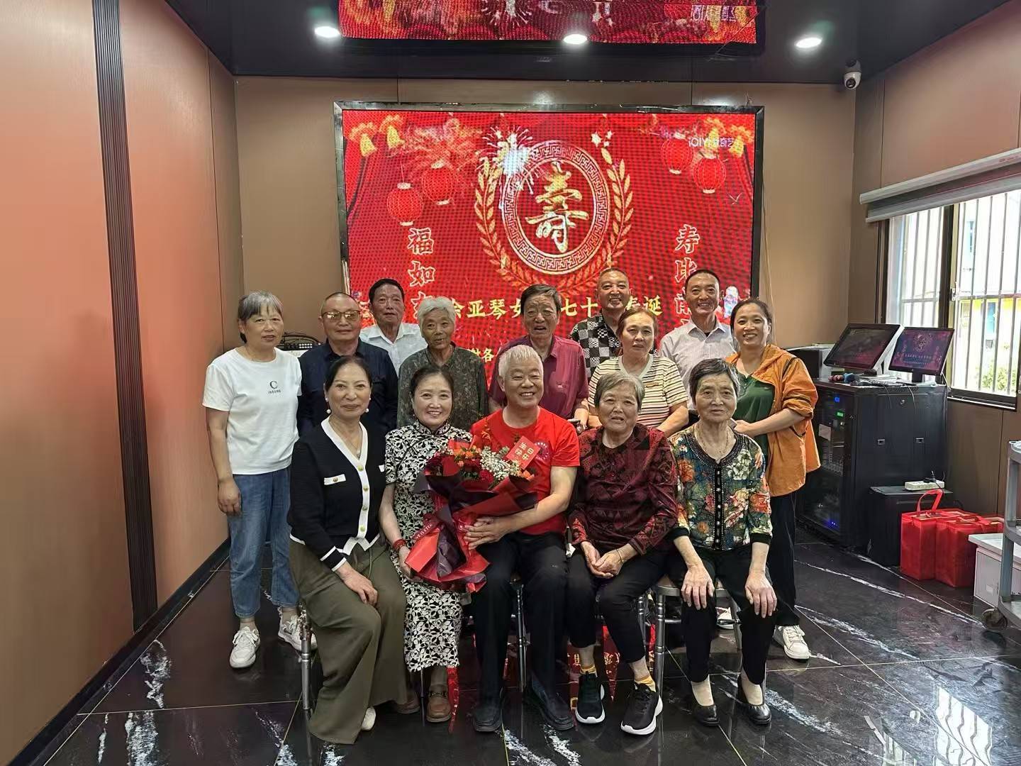 谁想古稀时,乌发童颜美。祝寿声声振耳,好不欢喜?舞姿蝶羡,展袖疑云霨。齐敬酒,比山松,如海水。