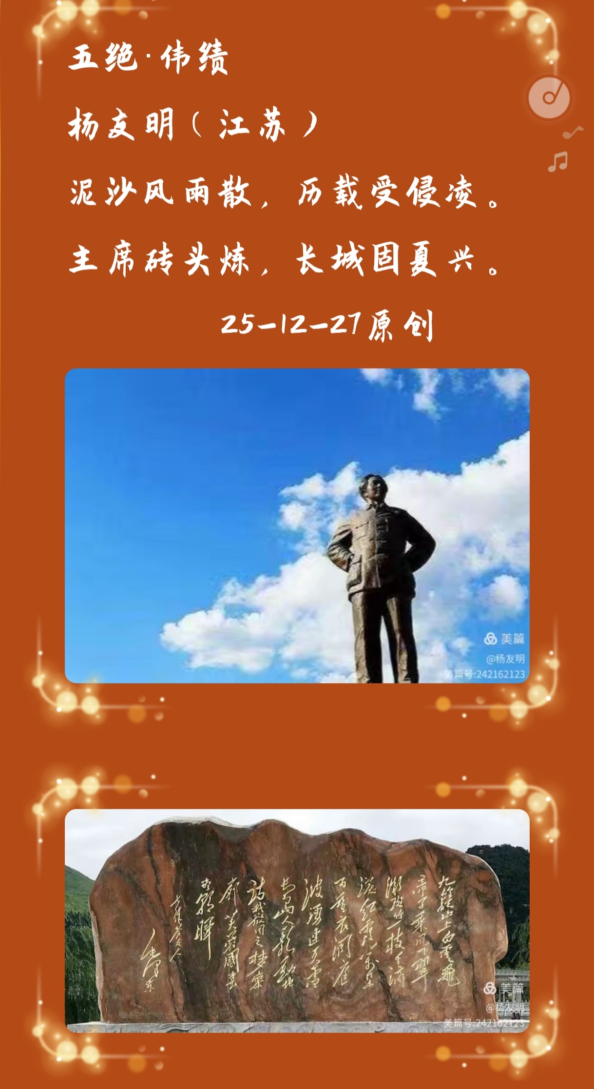 3.情感传递:真挚直接,不刻意雕琢情感表达摒弃“曲笔”,多为直白流露,让情绪自然融入场景,不做刻意煽情或抽象抒情。如《赞成功·庆抗战胜利八十周年》中“雪耻尤记,烽火连天。日倭烧杀实凶残”,直接陈述抗战历史的惨痛与对先烈的缅怀,情感直白有力,无过度修饰却极具感染力;又如描写日常闲情的作品,仅通过“悠闲逛”“约鱼忙”等行为细节,便自然传递出轻松、惬意的情绪,无需额外用“愉悦”“闲适”等词汇点明,情感表达含蓄却质朴真诚。