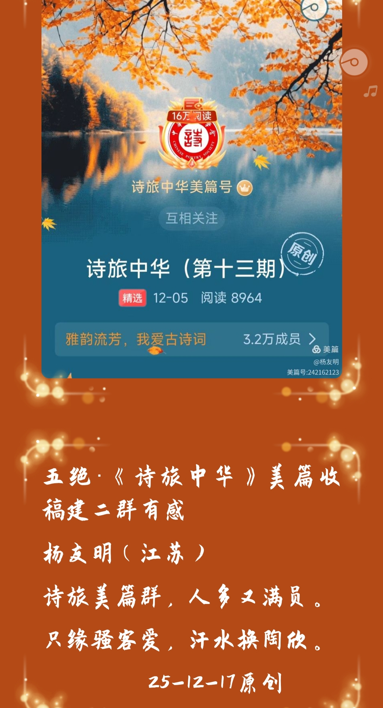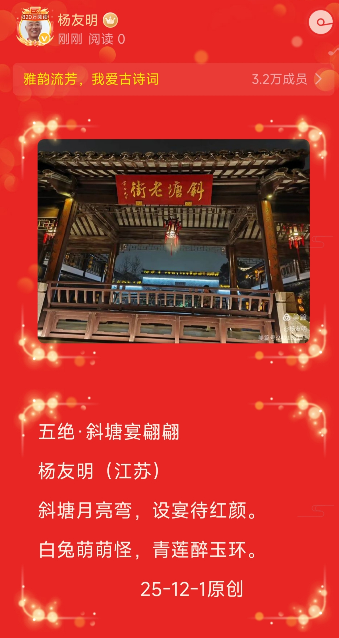2.传播价值:强化诗词的“大众共情力”与“当代生命力”现代读者对脱离生活的“空洞情”或“晦涩意象”接受度较低,而杨友明的质朴风格恰好契合这一需求——作品聚焦“夜钓”“农闲”“思亲”等普通人的生活与情感,语言直白、情感真挚,极易引发读者的生活共鸣(如“翁婆盼儿归”的亲情描写)。这种“接地气”的表达,让诗词不再是“小众自赏”的文体,而是能走进大众日常生活的情感载体,有效拓宽了传统诗词的当代传播范围,赋予其更持久的生命力。