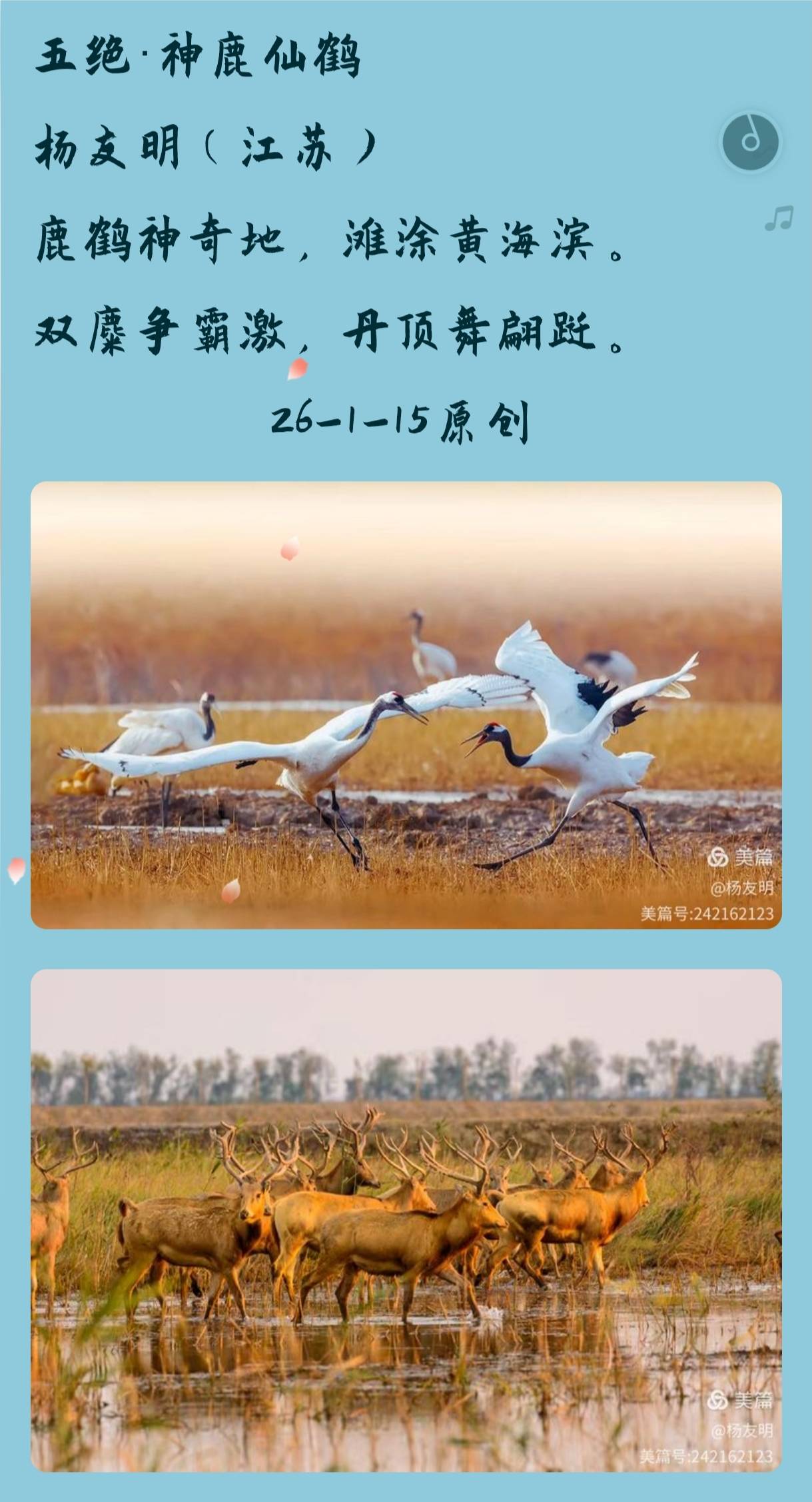 ·地域文化传播:诗词中常运用盐城的“丹顶鹤”“麋鹿”、苏州“园林”等地域特色意象,展现了当地的文化风貌,有助于传播地域文化,增强人们对家乡文化的认同感和自豪感。