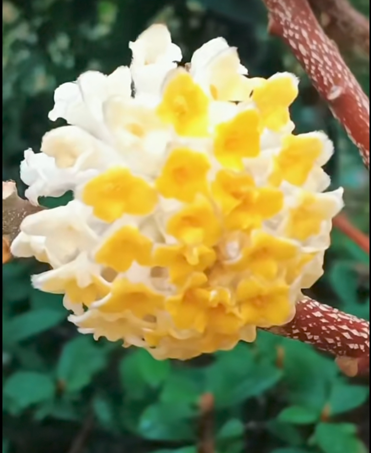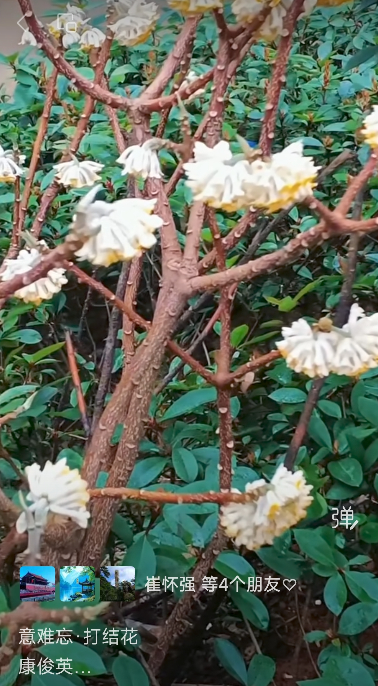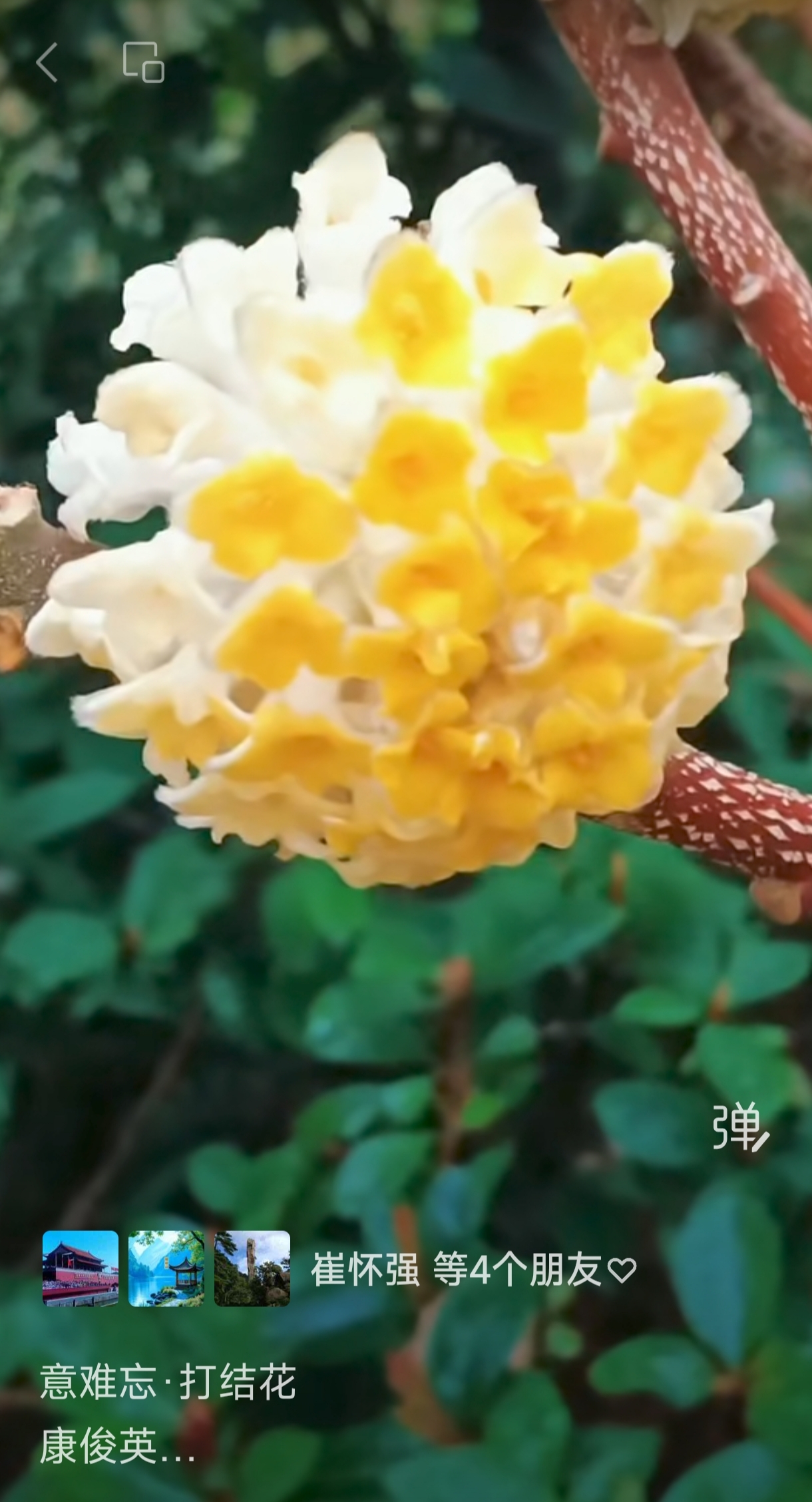 缘梦园林赏奇葩。香透淡黄花。老枝打结,百灯垂挂,喜庆人家。