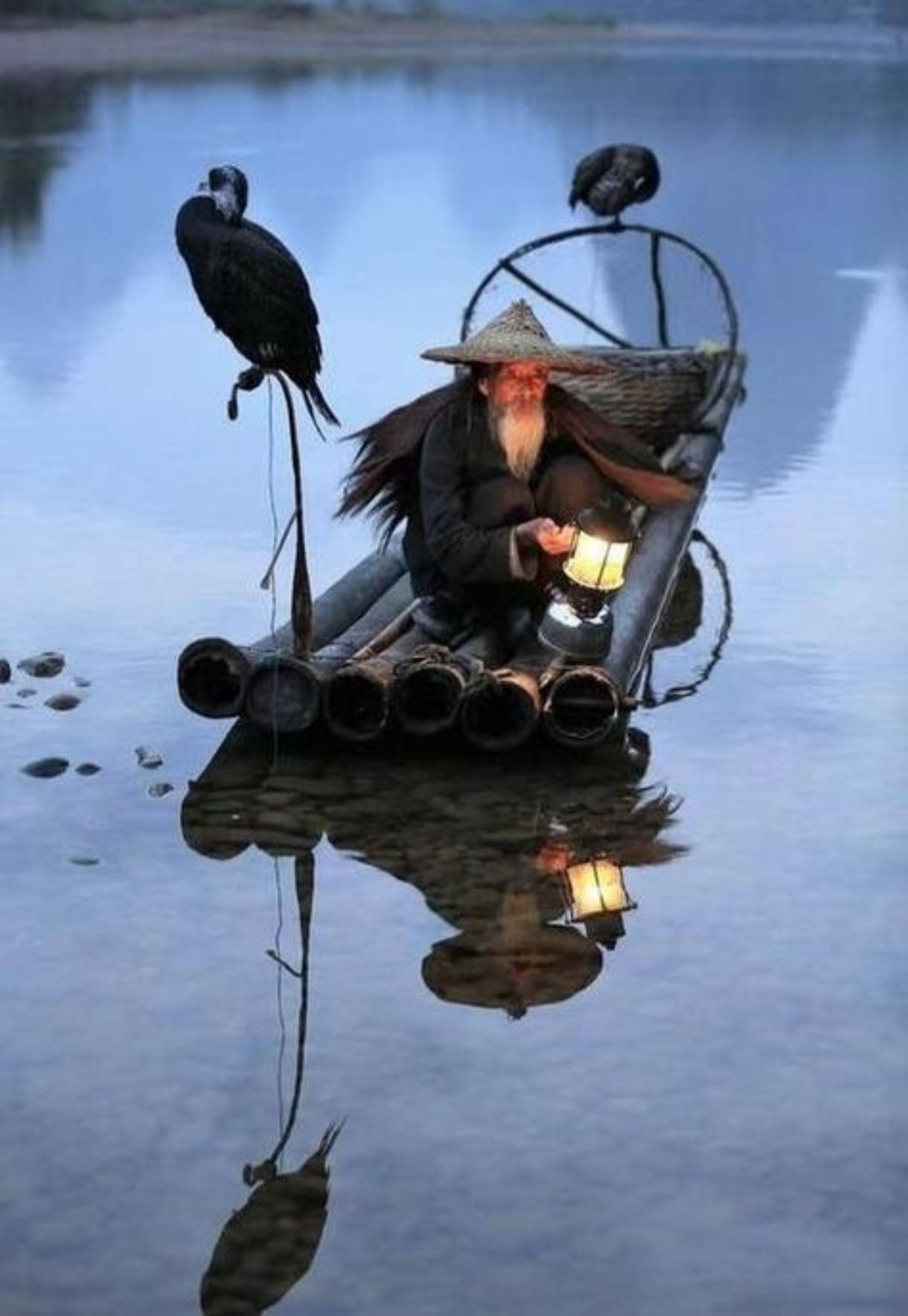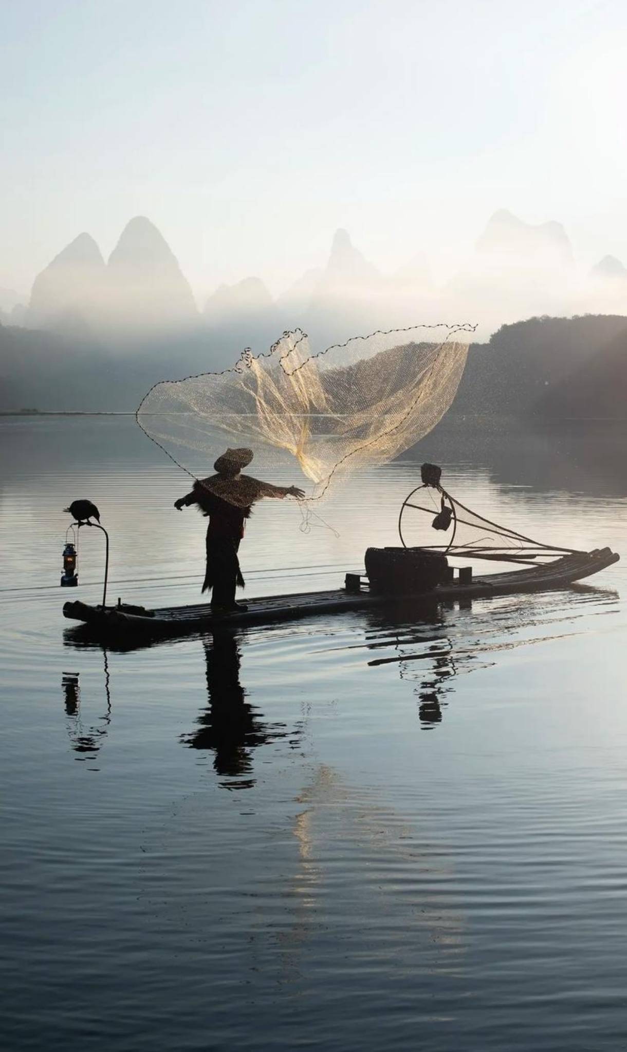 近水落山仍灿烂,余辉遍及天涯。横舟罢网煮鱼虾。月升星闪,渔火对千家。