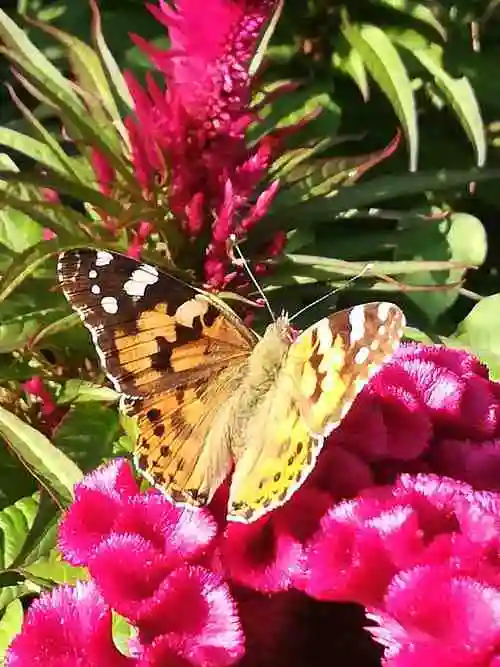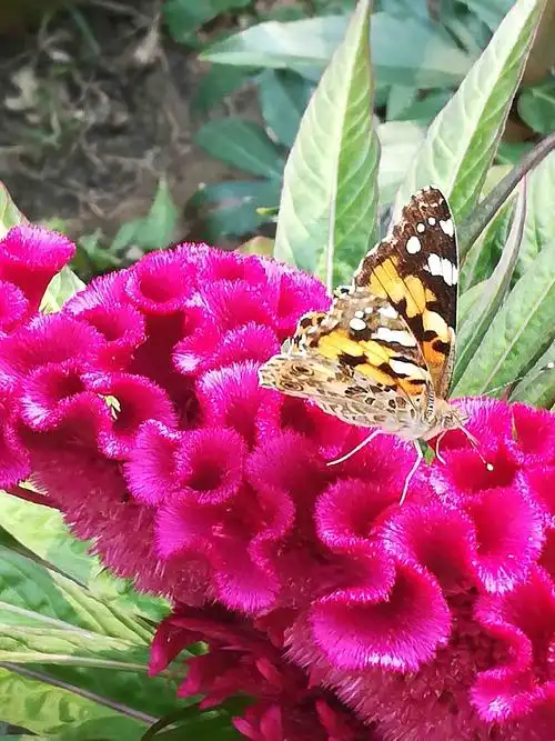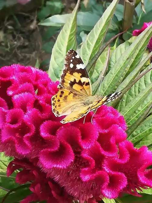 红炬烧。红炬烧。顶风冒雨挺其腰。扇面籽藏蝴蝶恋,鸡冠花美最招摇。