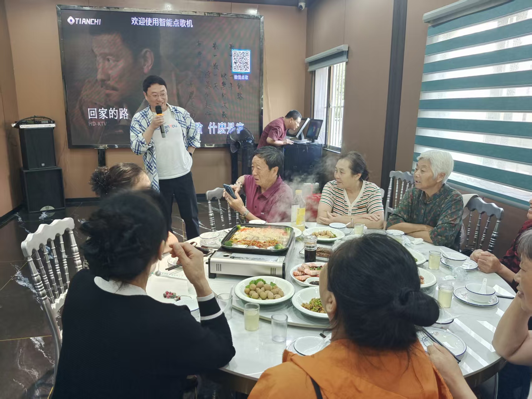 谁想古稀时,乌发童颜美。祝寿声声振耳,好不欢喜?舞姿蝶羡,展袖疑云霨。齐敬酒,比山松,如海水。