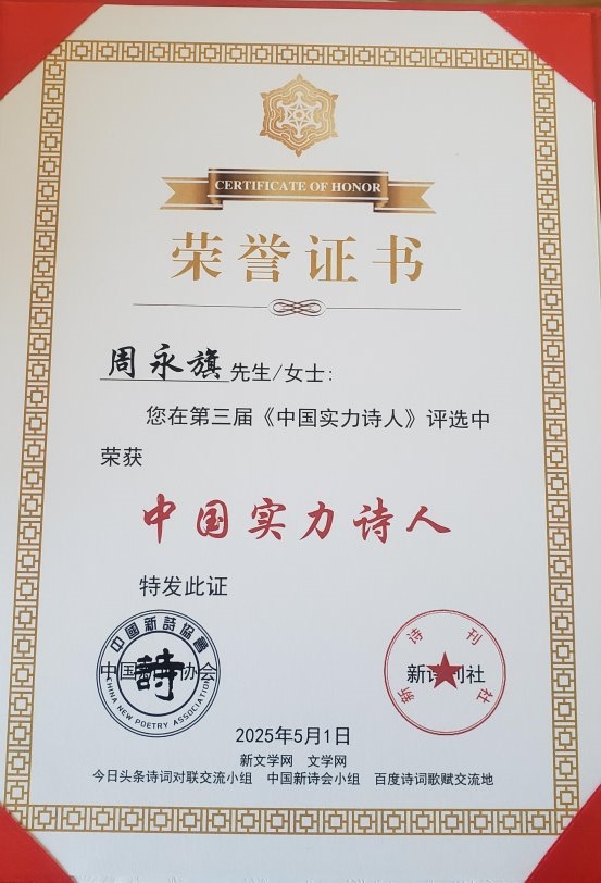 2025年5月1日,由中国新诗协会、新诗刊社联合颁发的第三届《中国实力诗人》荣誉证书正式授予诗人周永旗。这一奖项的获得,不仅是对其个人诗词创作实力的高度认可,也为当代传统诗词创作领域注入了新的活力。