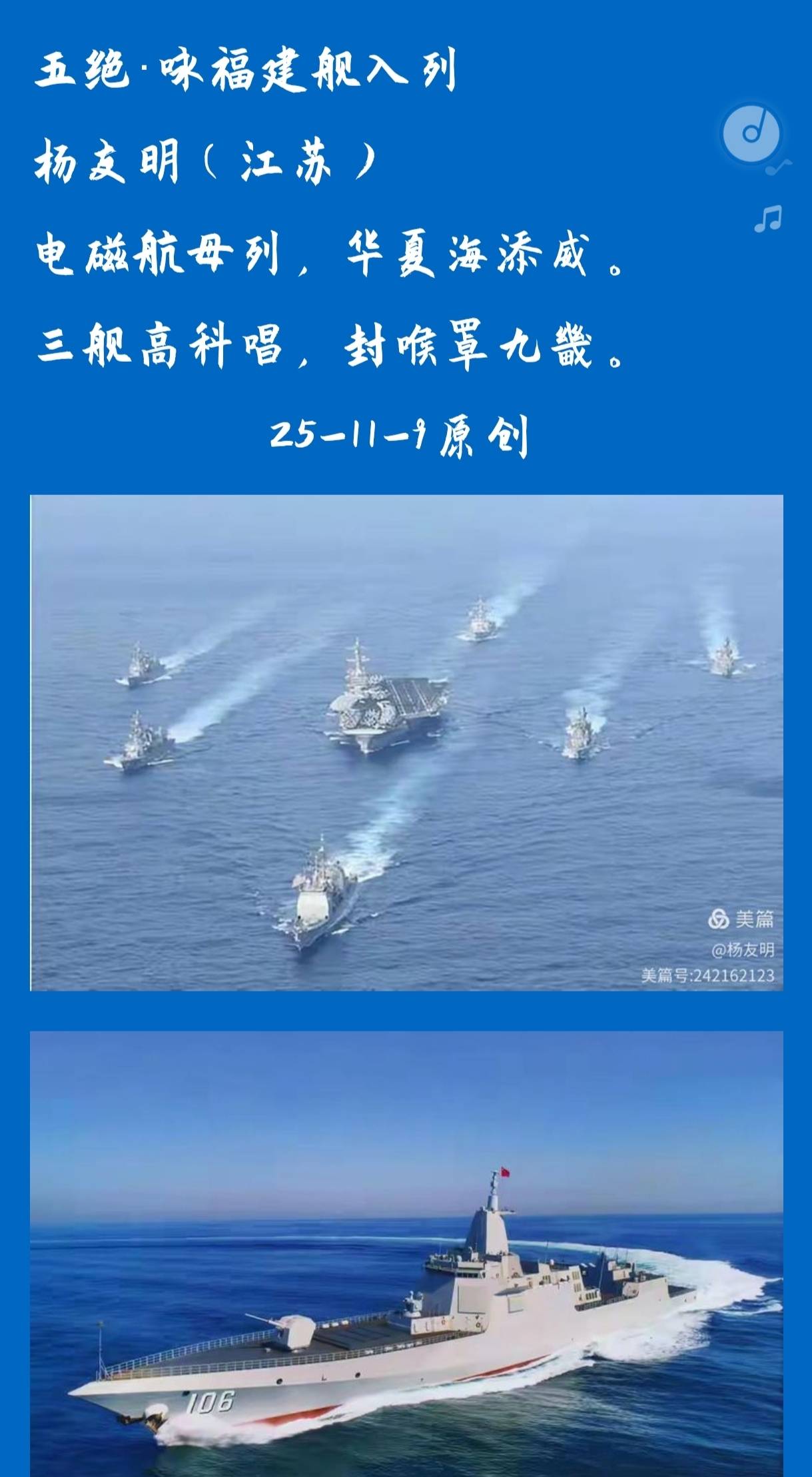 体现时代气息:现代元素的引入为诗歌营造了一种独特的音韵氛围,体现出时代的气息。“电磁航母”等词汇具有现代科技的质感,其发音也带有一种简洁、高效的感觉,与传统诗词中一些较为古朴的词汇发音相结合,形成了一种古今交融的音韵效果,使读者在感受传统音韵美的同时,也能体会到现代科技带来的新鲜感。