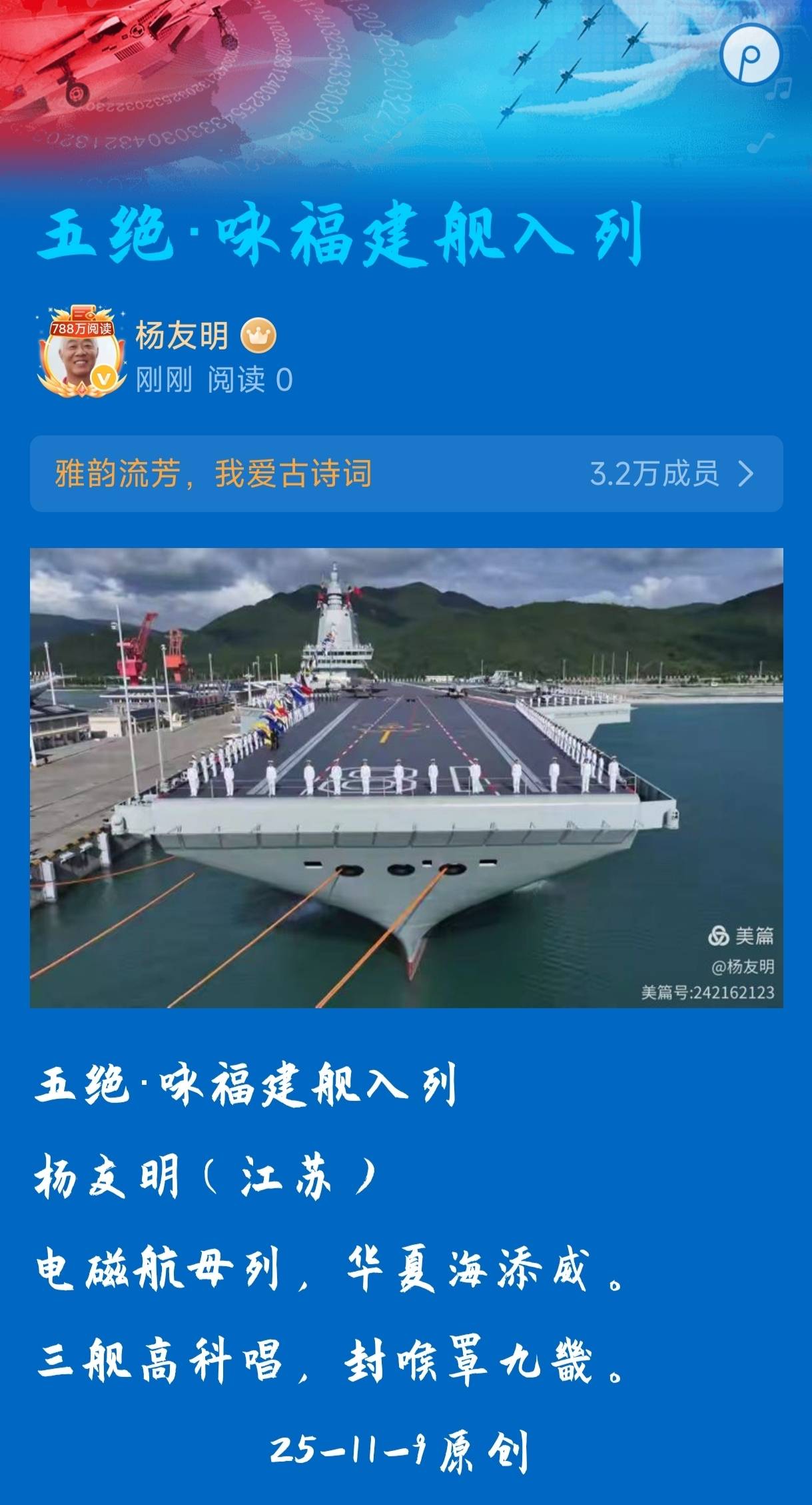 以杨友明的《五绝·咏福建舰入列》为例,“电磁航母列,华夏海添威。三舰高科唱,封喉罩九畿”。这首诗在平仄上,首句“电磁航母列”是仄仄平仄仄,符合仄起的格式;第二句“华夏海添威”是平仄仄平平,平起平收且押韵;第三句“三舰高科唱”是平仄平平仄,仄起仄收;第四句“封喉罩九畿”是平平仄仄平,平起平收且押韵,完全遵循了五绝的平仄规则。在押韵上,“威”和“畿”押“ei"韵,音韵和谐。这表明杨友明在引入现代元素创作五绝时,能够很好地遵循传统诗词的格律要求。