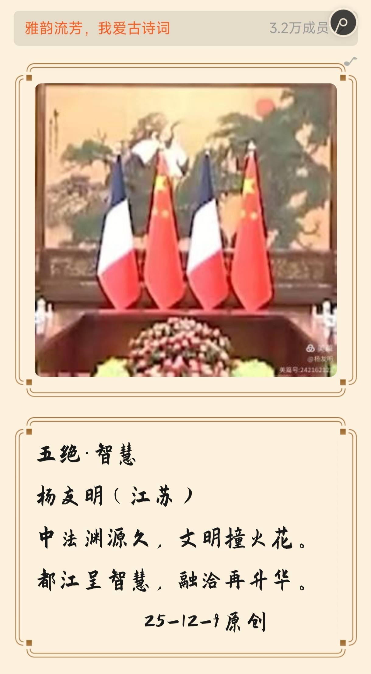时间上的延伸:传统诗词意境往往带有浓厚的历史感,而现代元素的加入让诗词能够映射当下与未来。以《五绝·咏福建舰入列》为例,“电磁航母列”中的“电磁航母”是现代科技的结晶,代表着当下我国军事科技的前沿成果。这一元素将诗词意境从传统的历史长河延伸至现代,让读者感受到时代的发展与变迁,使诗词具有了鲜明的时代印记。