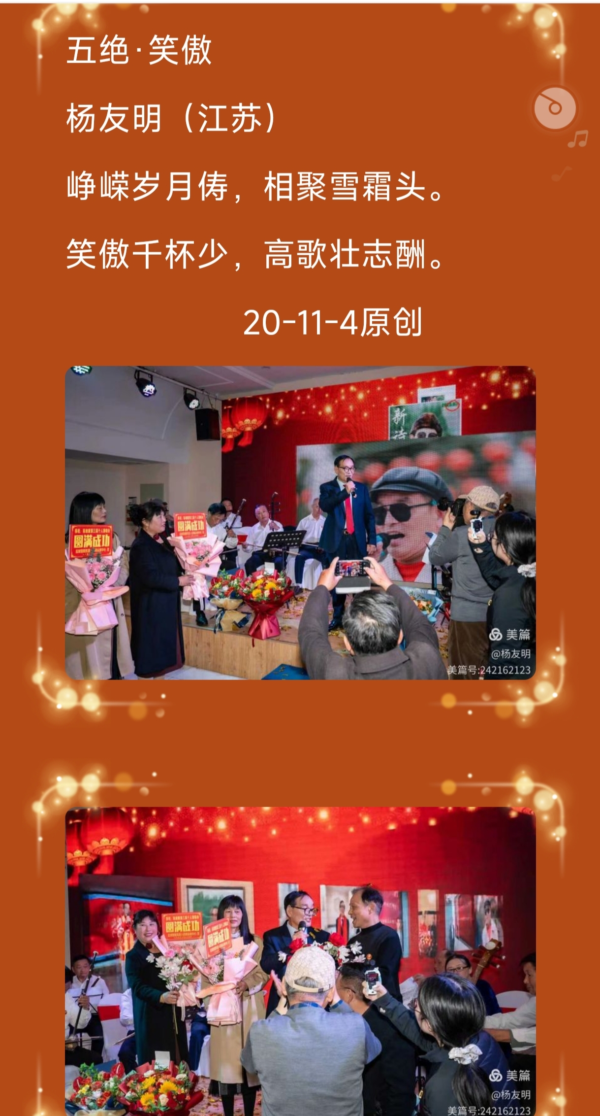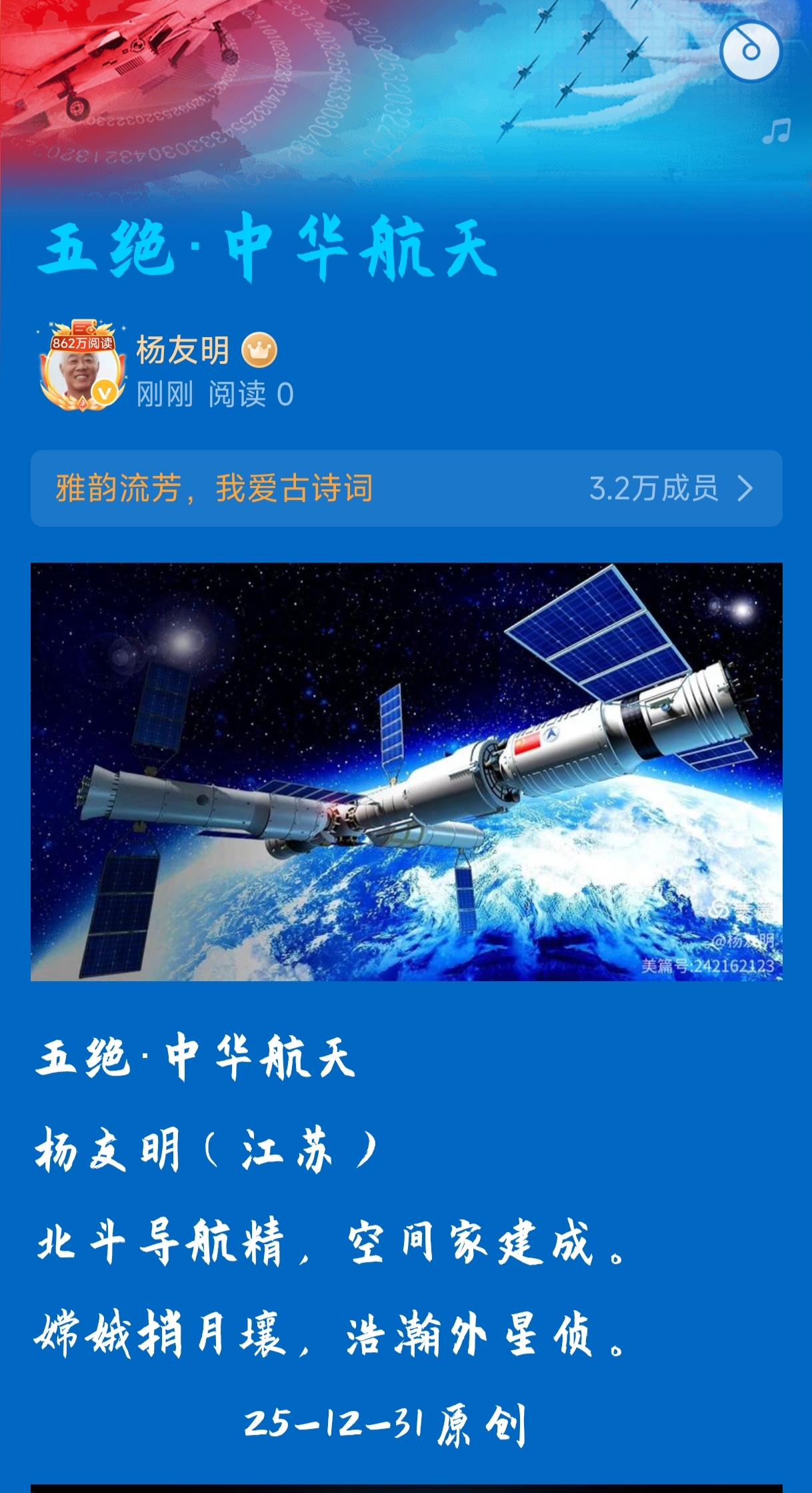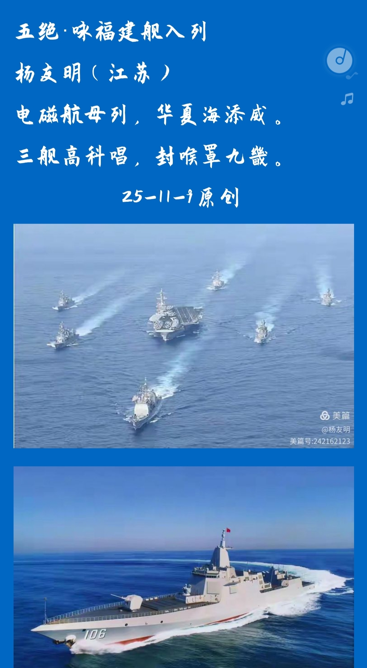 传承与创新传统诗词:杨友明在诗词中引入现代元素,如《五绝·咏福建舰入列》中的“电磁航母列”,既保留了传统诗词的格律和韵味,又贴合时代特色,为传统诗词注入了新活力。这为传统诗词在现代社会的传承与发展提供了新思路,证明传统诗词可以通过融入现代元素,实现创造性转化和创新性发展。