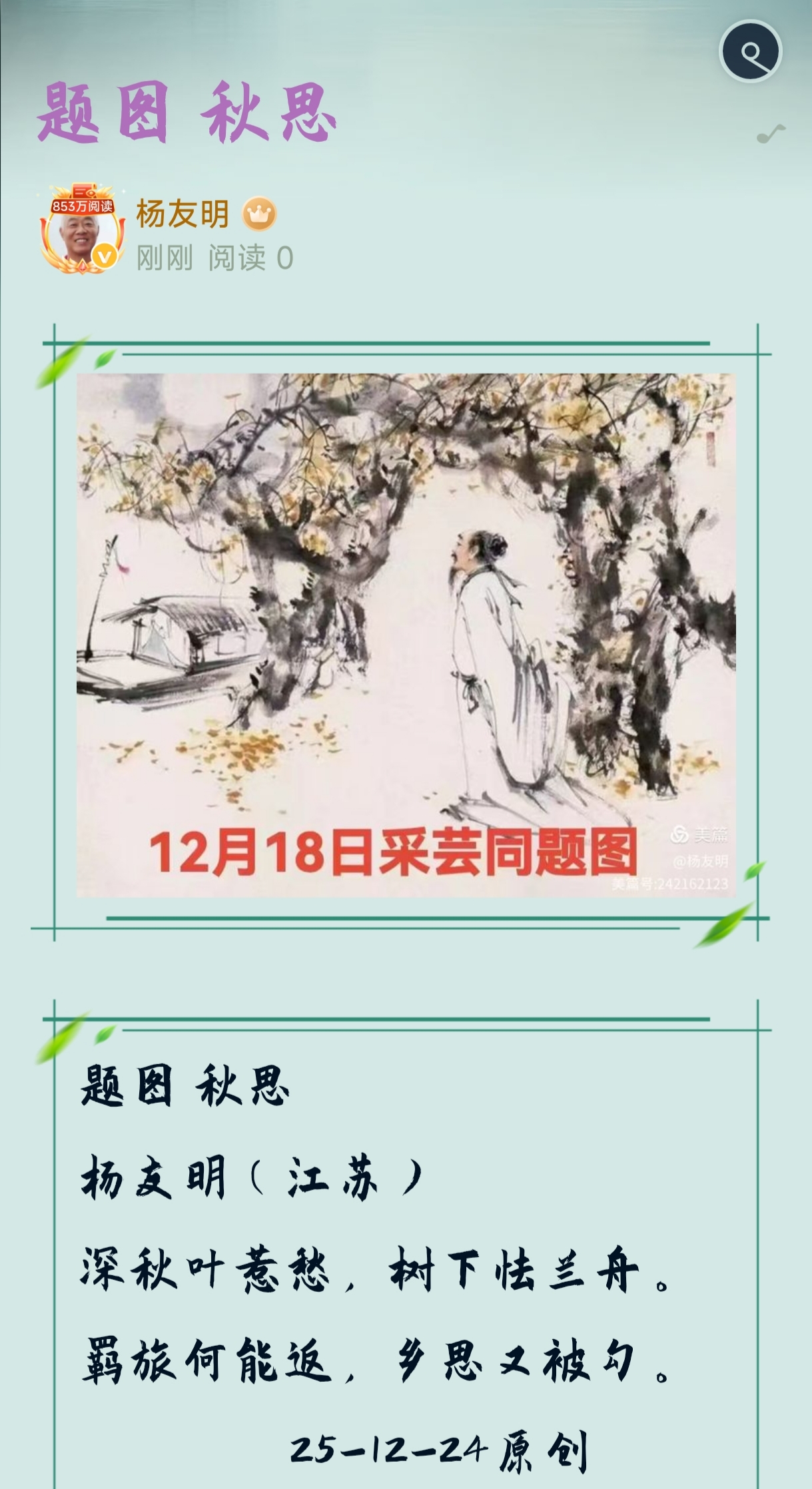 回归生活本真:现代诗坛部分作品存在脱离生活、过度追求抽象意境的问题。而杨友明诗词以日常生活为素材,如《五绝·城中征留地》中“种点时蔬菜,只为尝个鲜”,将种菜等日常小事入诗。这启示诗人应扎根生活,让诗歌反映真实的人间百态,重拾生活气息,避免陷入空洞无物的创作误区。