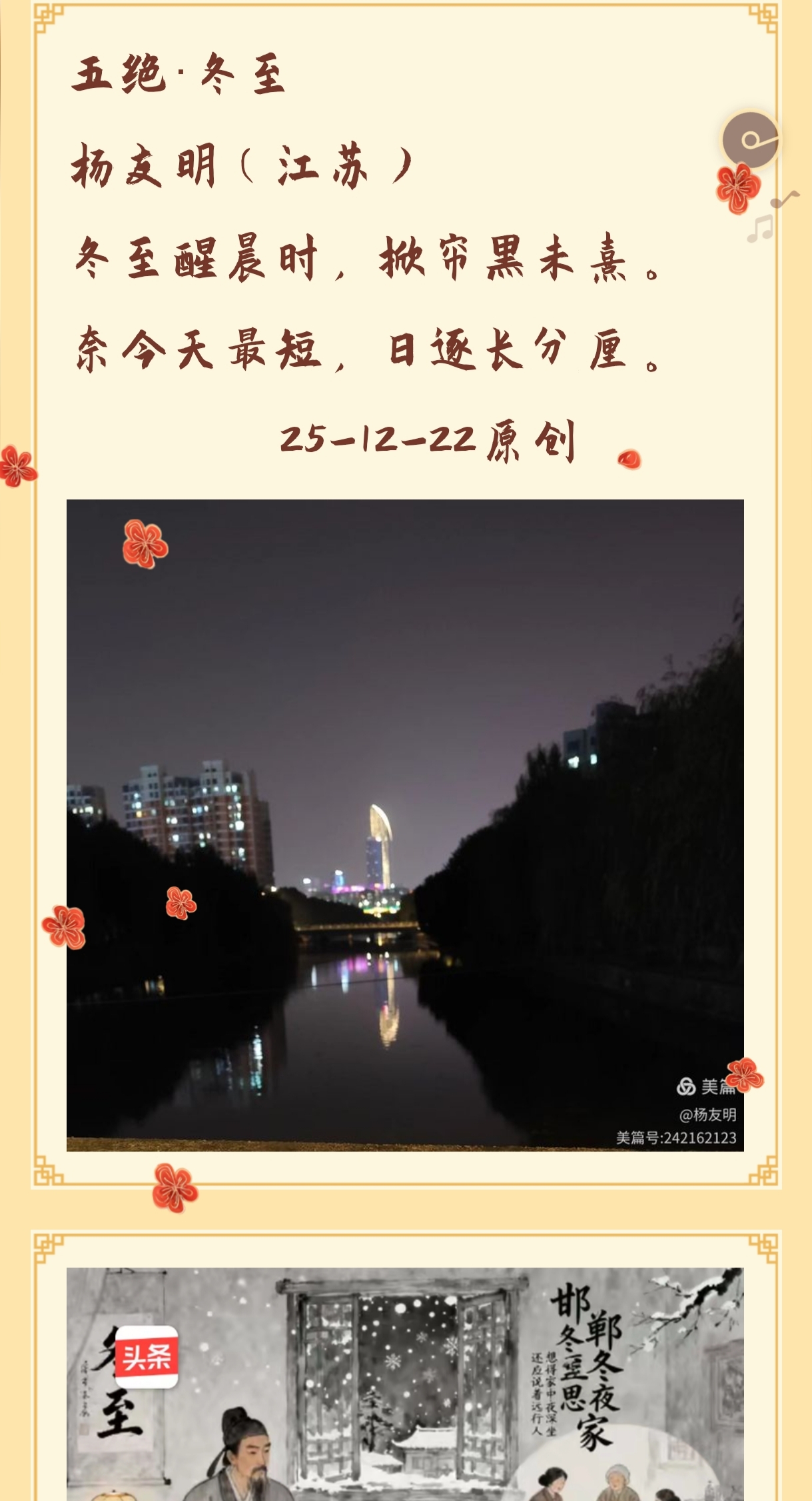 2.内容题材:聚焦日常烟火,扎根生活细节创作素材始终围绕普通人的生活场景与日常体验,而非宏大叙事或抽象抒情,充满“烟火气”。描写生活场景:如《醉翁操·立冬》中“粮食归仓藏完。麦菜新生田间。农忙偷点闲。围炉欢羊筵”,详细记录立冬时节“藏粮、田间麦菜、围炉宴饮”的农家日常,还原传统节气里的生活细节;