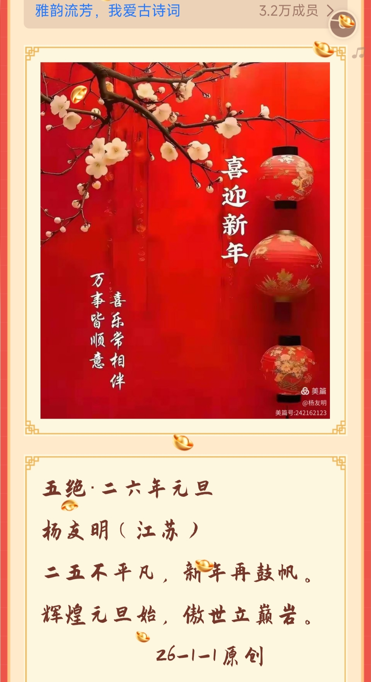 3.坚守“情感本真”,重塑诗词的“价值温度”部分现代诗词因过度追求形式创新或思想先锋,忽略了情感的真挚表达,导致作品缺乏打动人心的力量。杨友明的诗词虽语言质朴,却能直白传递“思兄弟之情”(《玉女摇仙佩·诗朋酒侣》)、“缅怀抗战先烈”(《赞成功·庆抗战胜利八十周年》)等真实情感,让读者感受到“不修饰的真诚”。这种风格提醒现代诗坛:诗词的核心价值在于情感共鸣与精神传递,而非单纯的形式或技巧。它推动了对“诗词本质”的回归,促使更多创作者在创作中重视“真情实感”,让现代诗词重新具备温暖人心、引发共情的“价值温度”。