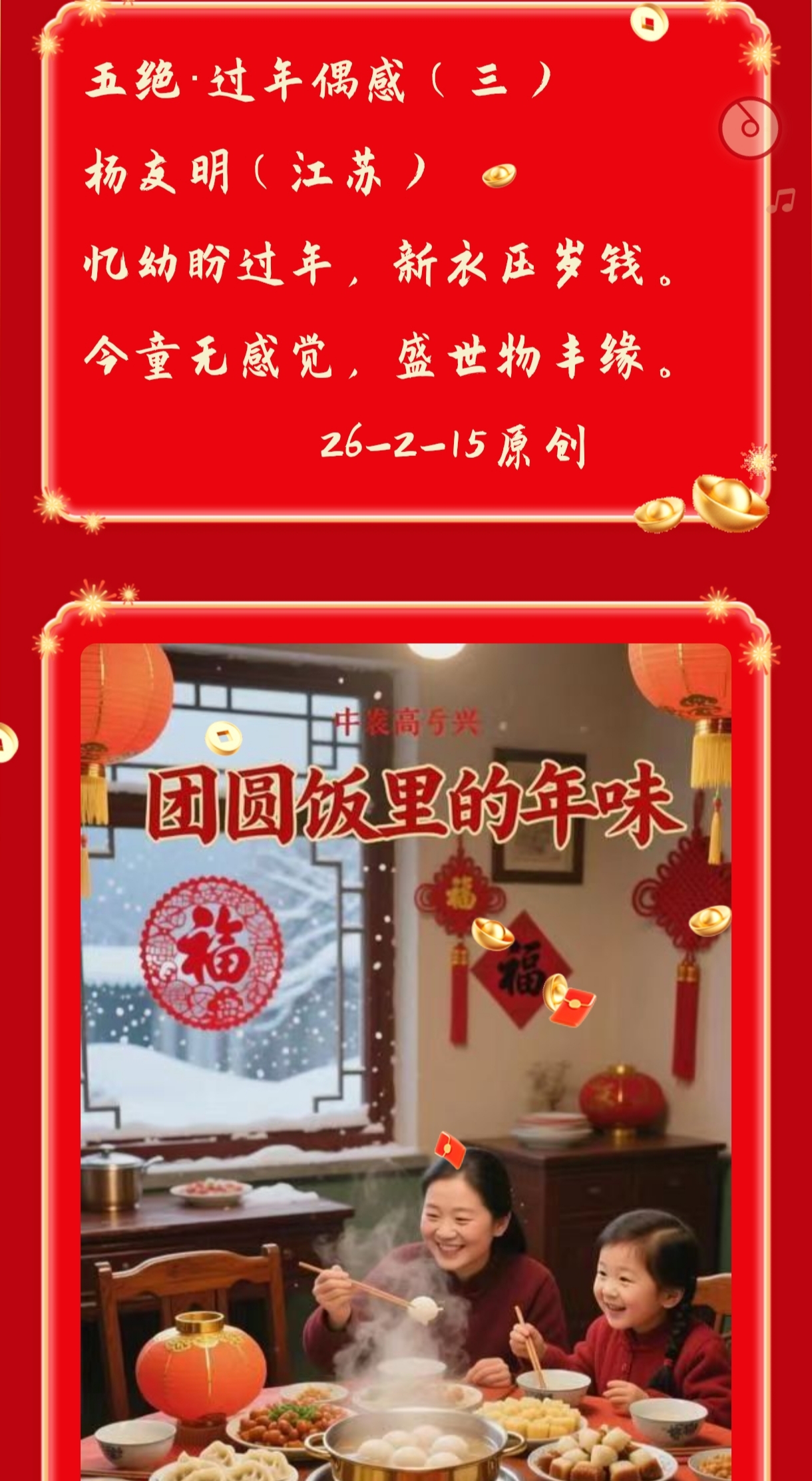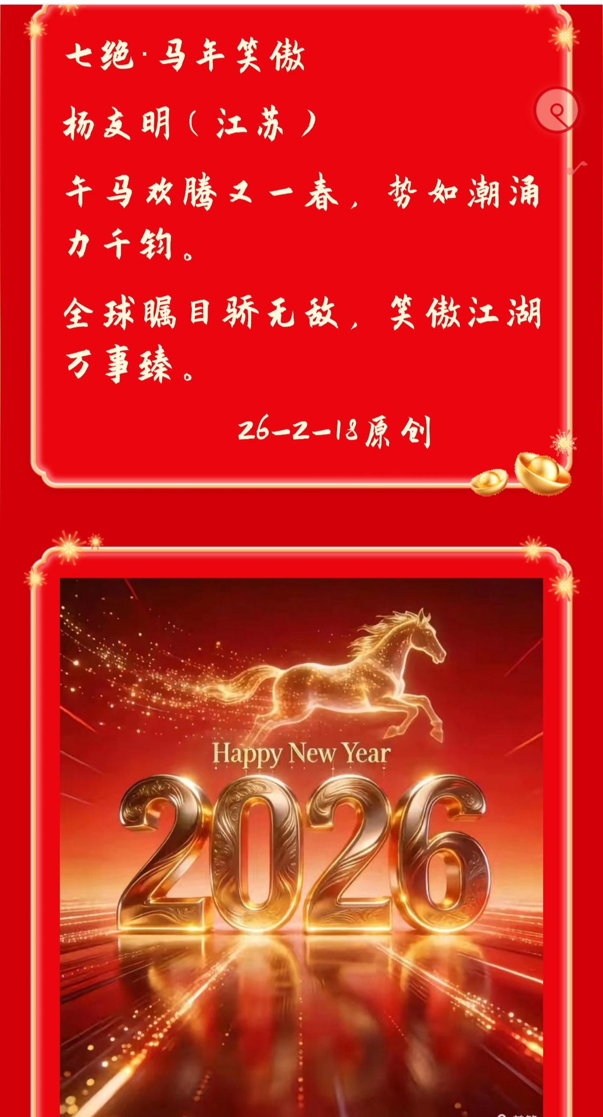 传统五绝多以自然、怀古、闺情等为核心题材,意象选择也局限于“明月、松竹、车马”等古典符号。而杨友明通过“古今意象融合”,让五绝既能承载“电磁航母、网络”等现代内容,又保留“平仄押韵”的格律美,突破了体裁本身的题材边界。例如“神舟冲碧汉,网络接寰球”,用“神舟”“网络”(现代)与“碧汉”“寰球”(传统)的融合,使五绝从“怀旧载体”转变为“记录当下、展望未来”的工具,让这一千年诗体在当代仍能“发声”,避免了古典诗词因题材脱节而陷入的传承困境。