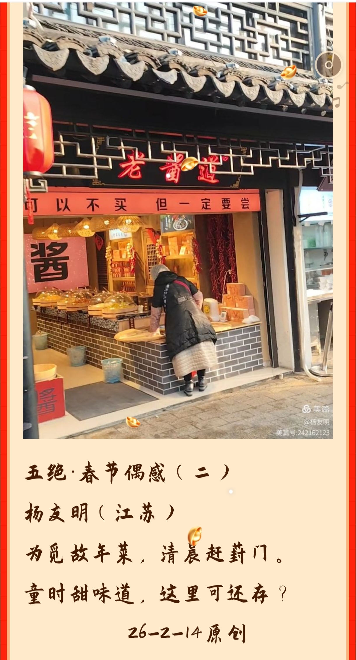 过往古典诗词创作常陷入“仿古”或“离古”两个极端——要么一味堆砌古典意象,显得脱离时代;要么用现代白话写诗词,又失了格律韵味。杨友明的融合方式,创造性地搭建了“古今对话”的桥梁:以传统意象铺垫诗词的“古典底色”,用现代意象注入“当代灵魂”,二者并非简单叠加,而是形成“1+1>2”的表达效果。如“网络真奇妙,天涯近若邻”,“网络”(现代)解决了“如何写当下”的问题,“天涯”(传统)则延续了古典诗词中“距离与思念”的情感内核,让“科技便捷”的现代主题,有了“古典诗意”的温度,为当代诗词创作提供了“既守古、又创新”的范式。