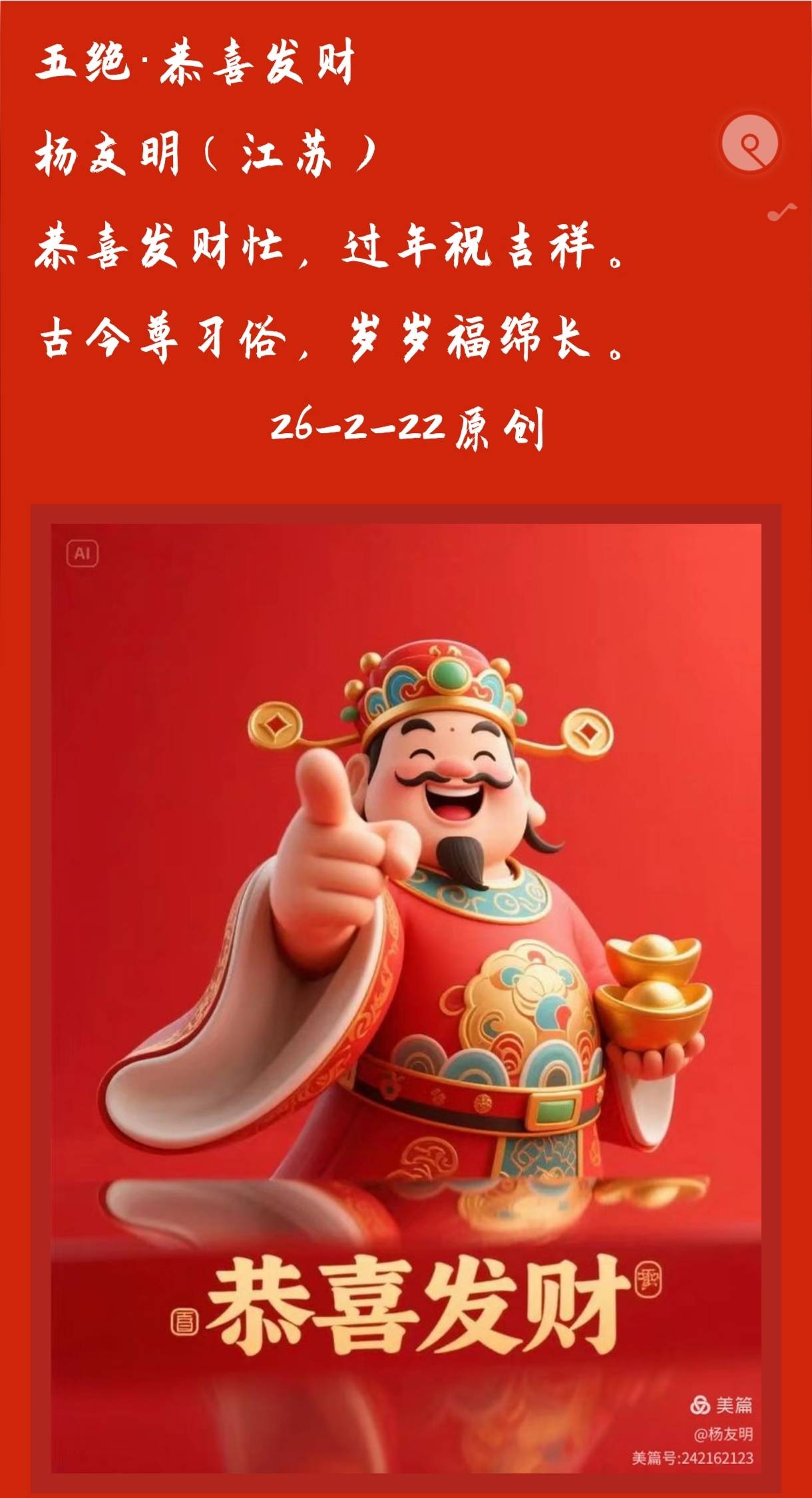 杨友明五绝格律严谨的核心好处,是让诗歌在短小篇幅内兼具音韵美感与结构稳定性,同时强化情感与内容的表达效果。