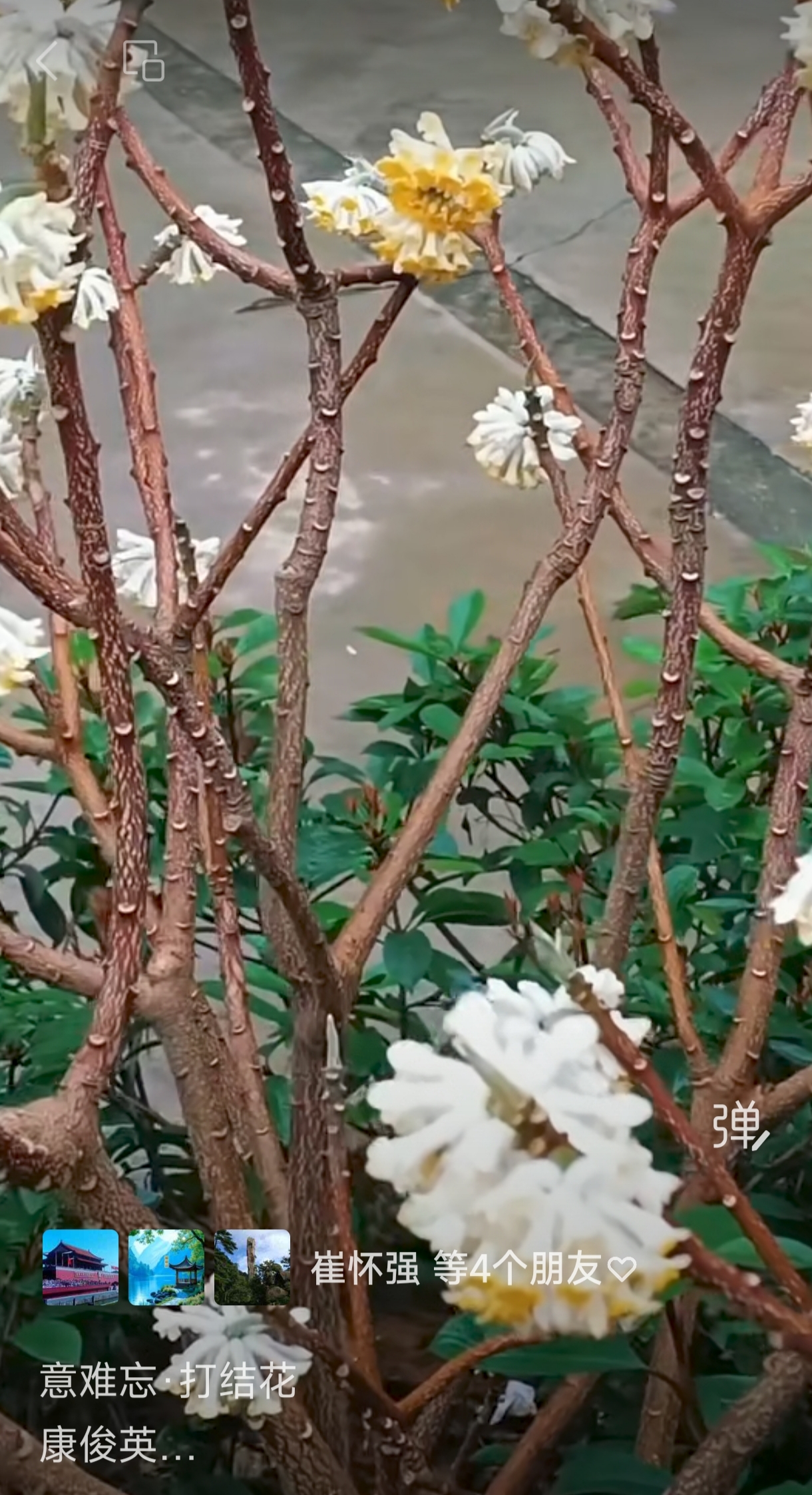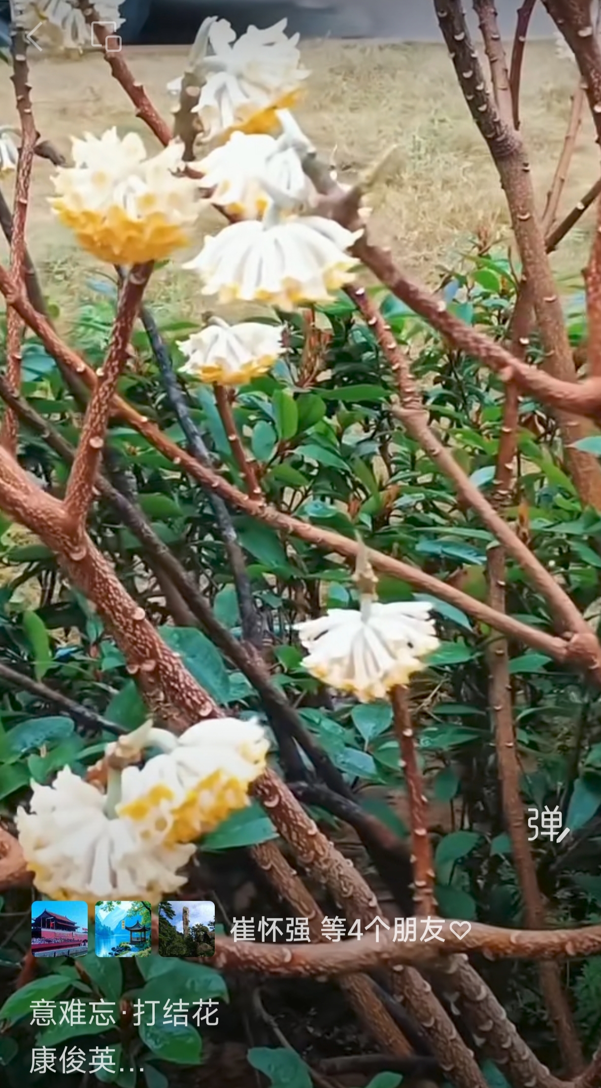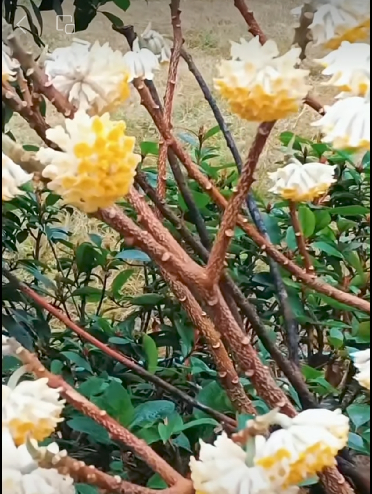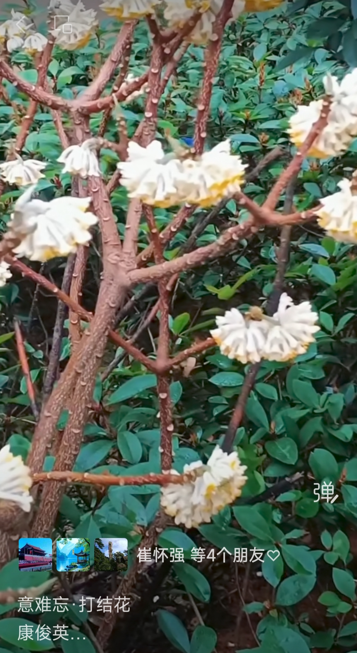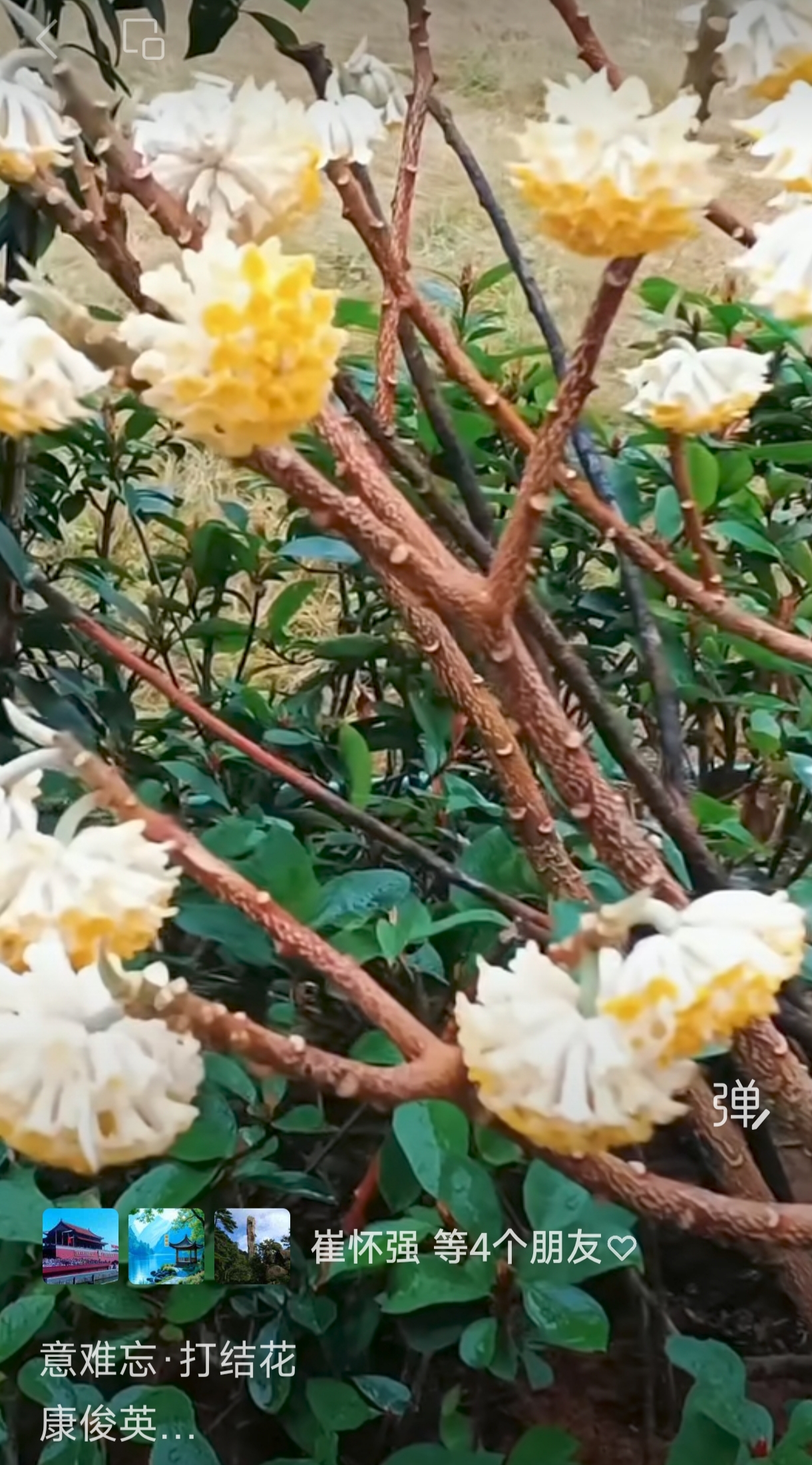 缘梦园林赏奇葩。香透淡黄花。老枝打结,百灯垂挂,喜庆人家。