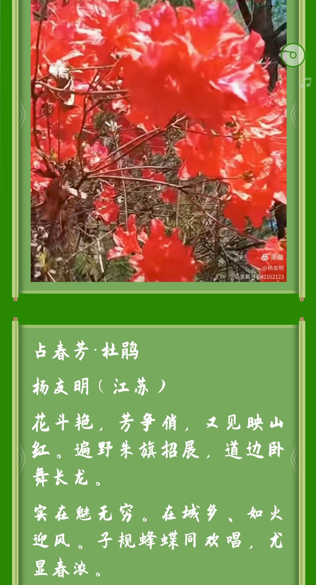 总之,通过对平仄规律的把握,可以更敏锐地感受杨友明律诗在音韵、情感、结构等方面的独特魅力,从而获得更丰富、更深入的欣赏体验。但同时,也要结合诗歌的意境、意象、修辞等其他要素进行综合欣赏,以全面领略其艺术价值。