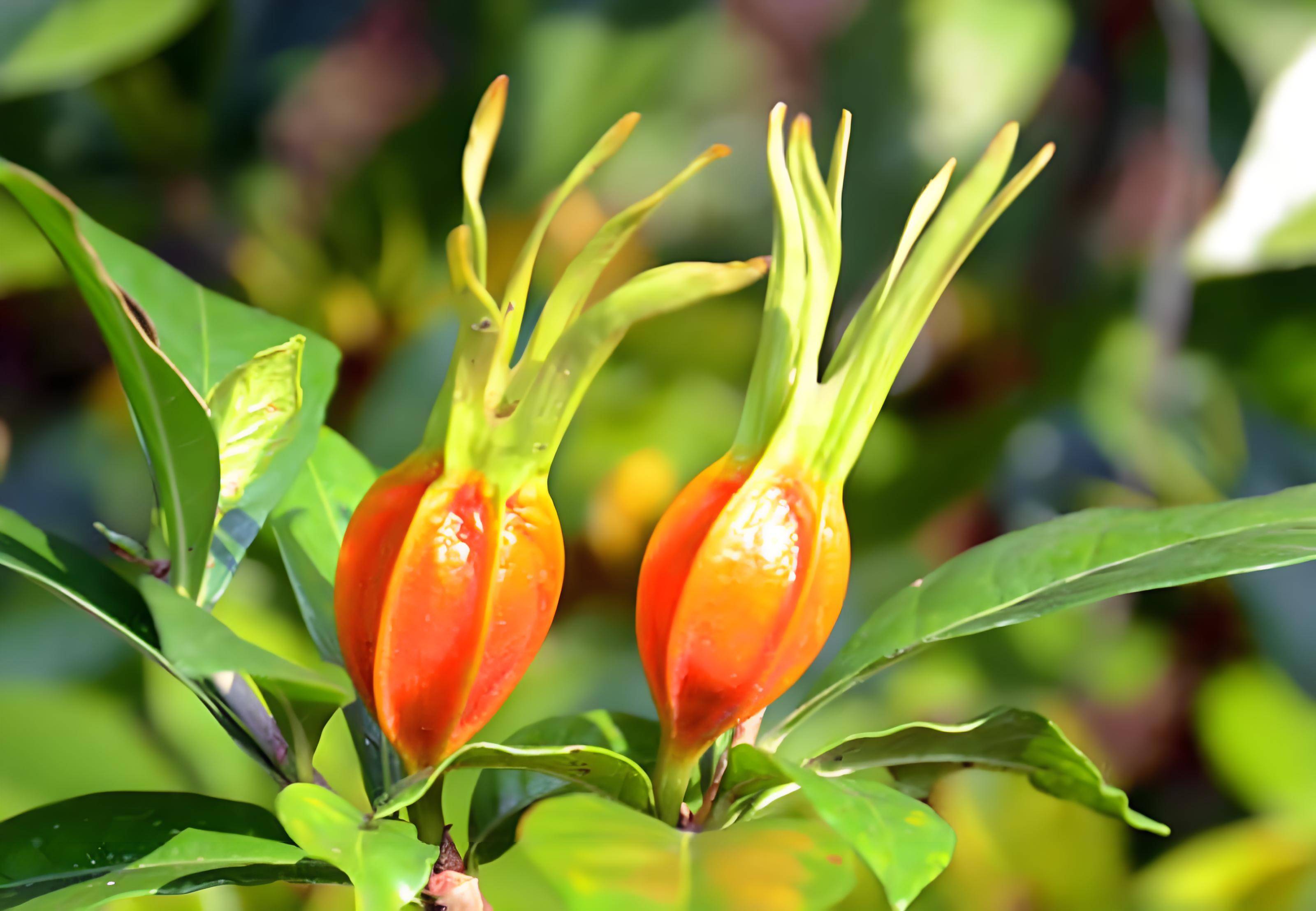 2. 红实:黄栀子成熟果实呈红黄色,具6条翅状纵棱,为其典型性状。